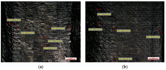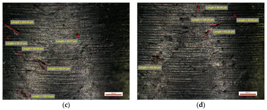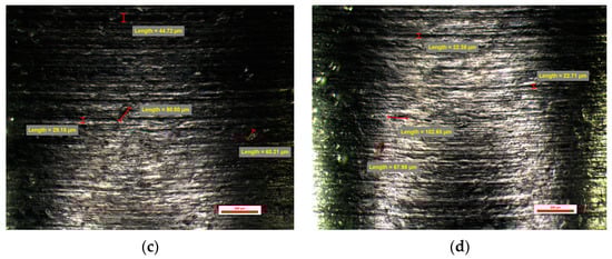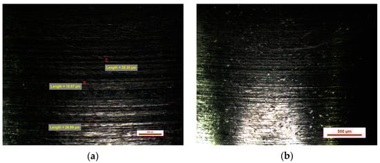 The evaluation of the surface of the emergence profile of the original dental implant stock abutments BS-Exso was performed at a magnification of 30×, 45×, and 75×, and at the magnification of 75×, several random measurements were made on horizontal micro-grooves observed on the sample surfaces, each face having a slightly different appearance compared to the other faces of the same dental implant abutment. Micro-grooves show the normal circular appearance of traces of machining tools with different sizes from 10 to 30 µm on all sides of the prosthetic abutments. Certain micro-cavities with dimensions of more than 100 µm have also been observed. All these micro-cavities come from the homogeneity of the titanium material used in the form of a bar in the cutting process rather than from the quality of the working tools (Figure 11).