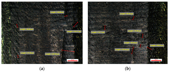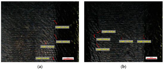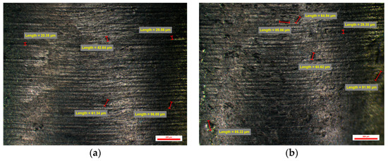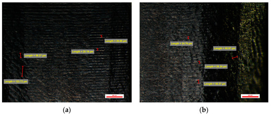 The evaluation of the surface of the emergence profile of the dental implant abutments was performed at a magnification of 30×, 45×, and 75×, and at the magnification of 75×, several random measurements were made on horizontal micro-grooves observed on the sample surfaces.