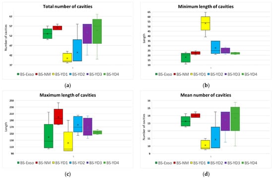 One of the abutments from the BS-YD1 group had the smallest number of overall cavities from the entire study lot—namely 38. The maximum was 44, and the mean value was 10.10 ± 0.63 cavities per abutment. The sizes of the cavities were larger than those of the previous groups, with a minimum value of 53.75 µm (on face D), and the same abutment had a maximum value of 189.92 µm (on face C)—which is also the highest maximum value from this group. Min–max percentual variations were similar between all abutments from this group, with values comprised between 34% and 72%.