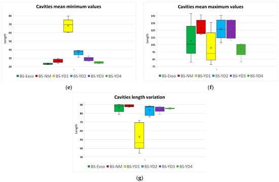 The abutments from the BS-Exso group had between 51 and 54 microcavities, with a mean value of 13.25 ± 0.68 cavities per face. The minimum value recorded for this study group was 10.87 µm (on face A), and the same abutment had a maximum value of 103.77 µm (on face D). Similarly, the maximum value recorded for this study group was 214.65 µm (on face C), and the same abutment had a minimum value of 20.33 (on the same face C). Min–max percentual variations were comprised between 79% and 91%.