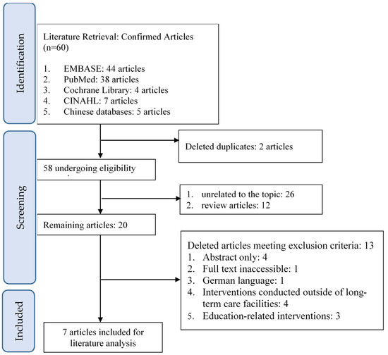 The present study’s inclusion criteria are studies focusing on interventions implemented in long-term care facilities (LCFs), utilizing approaches such as the Golden Standard Framework (GSF), Integrated Care Pathway (ICP), or other palliative care programs. Research designs may include both quantitative and qualitative methodologies. The exclusion criteria are studies involving populations from daycare centers or individuals not residing in institutionalized settings, studies presented in abstract format or inaccessible as full-text articles, and articles not published in English or Chinese.