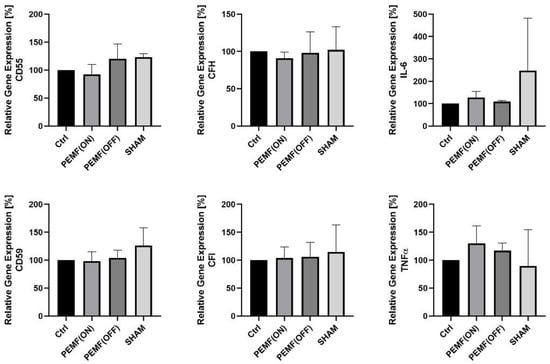 Our immune system is very complex because it requires a balanced hemostasis of soluble as well as membrane-bound pro- and anti-inflammatory components, such as cytokines and complement factors. The focus of this study was limited to two soluble complement factors (CFH and CFI), two membrane-bound complement factors (CD55 and CD59), and two pro-inflammatory cytokines (TNFα and IL-6). The overall complexity of the interplay between numerous complement factors and immune regulatory cytokines (such as IL-1, IL-33, IL-37, IL-10, etc.) needs further investigation. In addition to the production of these components, the effects of PEMF stimulation on phenotype, cell proliferation, and migration should be studied thoroughly in future research. This is also a limitation of our study.