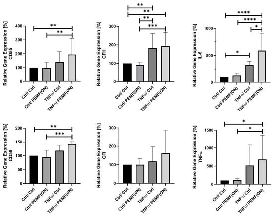 Graphic representation of relative gene expression of complement factors (CD55, CD59, CFH and CFI) and cytokines (IL-6 and TNFα) in synovial fibroblast cell line K4IM after PEMF stimulation [PEMF(ON)] with and without 24 h TNFα pre-stimulation (10 ng/mL) compared to their respective control (ctrl). A one-day stimulation protocol was used. Ctrl = non-stimulation. n = 5 independent experiments. Mean with standard deviation (SD). Non-stimulated group without TNFα pre-stimulation (Ctrl/Ctrl) has been normalized to 100. Repeated measures one-way ANOVA using Tukey’s multiple comparisons (*). * = p ≤ 0.05, ** = p ≤ 0.01, *** = p ≤ 0.001, **** = p ≤ 0.0001.