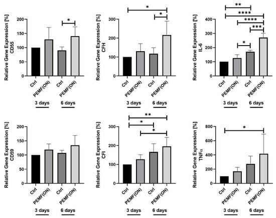 Study 3: In this experimental setup (Table 3), the PEMF stimulation duration was extended to examine its long-term effects compared to previous studies. Thus, synovial fibroblasts were stimulated with PEMF(ON) for 3 days and 6 days, with respective non-stimulated groups serving as controls. After 3 days of stimulation, no significant changes were observed in the gene expression of the analyzed proteins compared to the non-stimulated control. However, there was a notable trend toward increased gene expression in all proteins. After 6 days of stimulation, there was a marked increase in gene expression. Specifically, CD55, CFH, and IL-6 gene expression showed significant elevation in the PEMF(ON) stimulated group compared to the non-stimulated control (Ctrl). Furthermore, the non-stimulated group (Ctrl) displayed significantly lower gene expression of CFI and IL-6 after 3 days compared to the same group after 6 days. Interestingly, the stimulated group PEMF(ON) after 3 days also exhibited lower expression of these genes compared to the same group after 6 days (Figure 4).