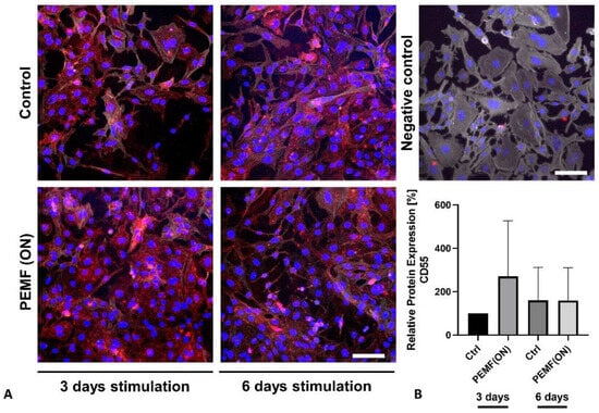 (A) Representative images of K4IM cell line after 3 days and 6 days PEMF(ON) stimulation compared to their non-stimulated counterparts, respectively (200× magnification), immunolabeled with a CD55 specific antibody and negative control of the staining. Red (Cy3) = CD55, blue (DAPI) = cell nuclei, gray (Phalloidin Alexa Fluor 633) = F-Actin cytoskeleton. Scale bar = 100 µm. (B) Graphic representation of relative CD55 protein fluorescence intensity, n = 4 independent experiments, mean with standard deviation (SD). Control (3 days) has been normalized to 100. Repeated measures one-way ANOVA using Tukey’s multiple comparisons.