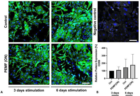 (A) Representative images of K4IM cell line after 3 days and 6 days PEMF(ON) stimulation compared to their non-stimulated counterparts, respectively (200× magnification), immunolabeled with a CD59 specific antibody and negative control of the staining. Green (Alexa Fluor 488) = CD59, blue (DAPI) = cell nuclei, gray (Phalloidin Alexa Fluor 633) = F-Actin cytoskeleton. Scale bar = 100 µm. (B) Graphic representation of relative CD59 protein fluorescence intensity, n = 4 independent experiments, mean with standard deviation (SD). Control (3 days) has been normalized to 100. Repeated measures one-way ANOVA using Tukey’s multiple comparisons.