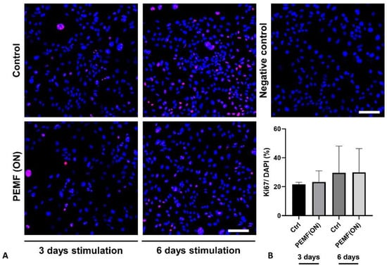 (A) Representative images of K4IM cell line after 3 days and 6 days PEMF(ON) stimulation compared to their non-stimulated counterparts, respectively (200× magnification), immunolabeled with Ki67 specific antibody and negative control of the staining. Red (Cy3) = Ki67, blue (DAPI) = cell nuclei. Scale bar = 100 µm. (B) Graphic representation of relative CD55 protein fluorescence intensity, n = 3 independent experiments, mean with standard deviation (SD). Control (3 days) has been normalized to 100. Repeated measures one-way ANOVA using Tukey’s multiple comparisons.