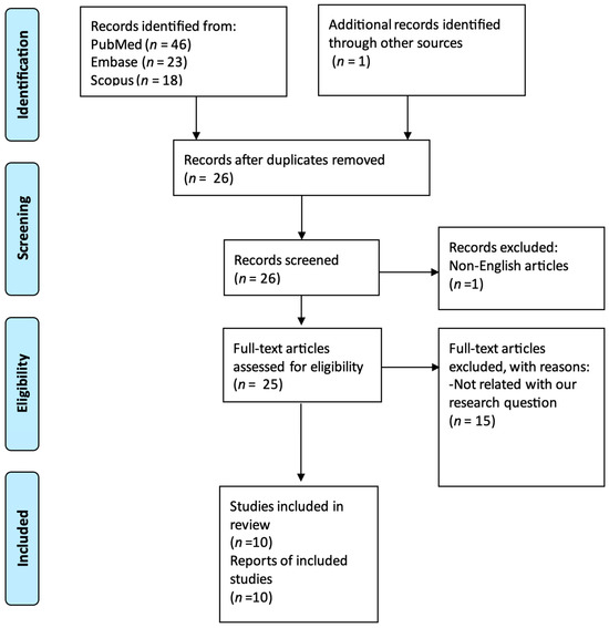 We performed a systematic literature review of all SCAD and ADPKD cases utilizing Preferred Reporting Items for Systematic Reviews and Meta-Analyses (PRISMA) guidelines, searching the Midline (via PubMed search engine), Embase, and Scopus databases. This study is registered with ResearchRegistry, and the unique identifying number is reviewregistry1828. All reported articles were analyzed from database inception until 1 April 2023. In total, 25 original articles were identified using a combination of MeSH and non-MeSH terms: (“polycystic kidney, autosomal dominant”[MeSH Terms] OR “autosomal dominant polycystic kidney*”[Text Word]) AND (“dissection, blood vessel”[MeSH Terms] OR “Coronary vessel anomalies”[MeSH Terms] OR “spontaneous coronary artery disease”[Text Word] OR “spontaneous coronary artery dissection*”[Text Word] OR “coronary artery dissection”[Text Word]). We identified 1 more case from another resource, but that case was excluded since it was published in Portuguese. We included cases with proven ADPKD and SCAD. The diagnosis of ADPKD was established based on clinical or genetic testing. The diagnosis of SCAD was established via coronary angiography. We excluded cases where the diagnosis of ADPKD or SCAD was not certain or there was a plausible alternative diagnosis. Furthermore, duplicate articles, articles in a language other than English, abstracts without comprehensive case descriptions, and narrative reviews were all excluded.