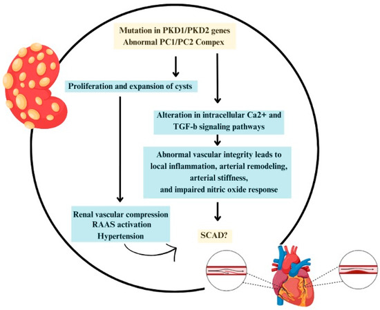 Pathogenic variants in PKD1 and PKD2 proteins not only lead to renal cystic formation with subsequent renal parenchymal destruction but also cause dysregulation in vascular wall signaling pathways, doubly influencing HTN development [44]. While hypertension is not traditionally considered a risk factor for SCAD, it is a prevalent condition among ADPKD patients, often occurring earlier than in the general population [45]. Notably, hypertension in these patients is preceded by endothelial dysfunction (ED). Endothelial dysfunction is mediated by a reduction in vasodilatory substances, including nitric oxide with increased production of pro-vasoconstrictive, pro-inflammatory, and pro-thrombotic mediators that can lead to vascular wall derangements and early atherosclerosis. Turkmen et al. examined coronary flow velocity reserve in 30 normotensive ADPKD patients with normal kidney function by using transthoracic Doppler echocardiography before and after dipyridamole infusion [46]. These patients were compared with 30 healthy individuals, and matched for blood pressure, weight, blood glucose, and lipid profile. Patients with ADPKD were found to show significant impairments of the coronary flow velocity reserve, which was found to be associated with cardiovascular events during long-term follow-up. Interestingly, this dysregulation, coupled with dysregulation in the vascular wall signaling pathway, may affect vascular wall stability, potentially contributing to SCAD development.