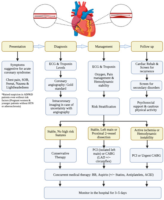 Our findings are consistent with previous SCAD reports in non-ADPKD patients, demonstrating several key similarities. Regarding demographic characteristics, the highest percentage of patients with SCAD and ADPKD includes females with a mean age of less than 50. This aligns with other studies on SCAD, with almost 90% of these patients being perimenopausal women [1,4,66]. Hormonal changes, in addition to decreased vascular integrity in ADPKD patients, could explain this finding. Additionally, LAD has been the most commonly affected coronary artery, which is also the case in non-ADPKD patients [67]. The presence of atherosclerotic risk factors in SCAD patients was believed to be less prevalent than that in those with ischemic cardiomyopathy. However, recent data indicate that these factors are present in older SCAD patients, showing no significant differences compared with other ischemic cardiomyopathies [1,4,66]. In our review, ADPKD-SCAD patients were found to have similar atherosclerotic risk factors as a non-ADPKD group. Hypertension was only reported in 30% of patients, and coronary artery disease was found in just 20% of coronary angiographs. The absence of conventional risk factors for myocardial infarction might lead to a delay in diagnosing SCAD. Therefore, maintaining a high level of suspicion, particularly in ADPKD patients, is crucial. Utilizing high-sensitivity troponins alongside coronary computed tomography angiography (CCTA) can be beneficial for patients experiencing chest pain and classified as being at low-to-intermediate risk of coronary events, as previously suggested (Figure 4) [10].