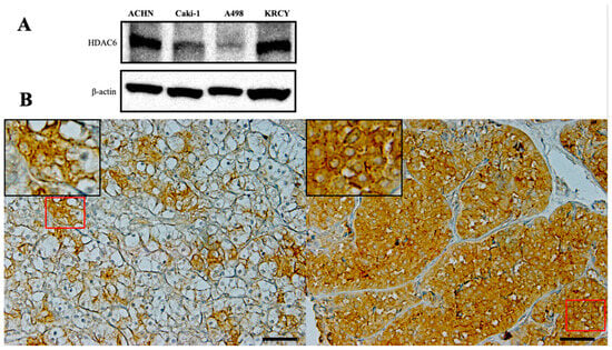 We purchased tissue microarray KD483 from US Biomax, which contained 27 RCC specimens. Immunohistochemical staining was performed as follows: After deparaffinization of paraffin tissue sections with xylene and ethanol, epitopes were reactivated by autoclaving in 10 mM citrate buffer (pH 6.0) for 20 min at 120 °C. The slides were then incubated overnight at 4 °C with the anti-HDAC6 antibody (Cell Signaling Technology, catalog number 7558). Subsequently, they were treated with Histofine Simple Stain MAX-PO (Nichirei, Tokyo, Japan) for 30 min at room temperature. Staining reactions were visualized using 3,3′-diaminobenzidine, followed by nuclear counterstaining with Mayer-Hematoxylin Solution (Fujifilm, Osaka, Japan). Staining intensity was graded as follows: 0, no staining; 1, weak staining; 2, moderate staining; and 3, strong staining. The proportion of stained cells was categorized as follows: 0, 0–4%; 1, 5–24%; 2, 25–50%; and 3, 50–100%. Immunohistochemical staining scores were determined by multiplying the intensity score by the proportion score. Low and high expression were defined by the scores between 0 and 4 and 6 and 12, respectively.