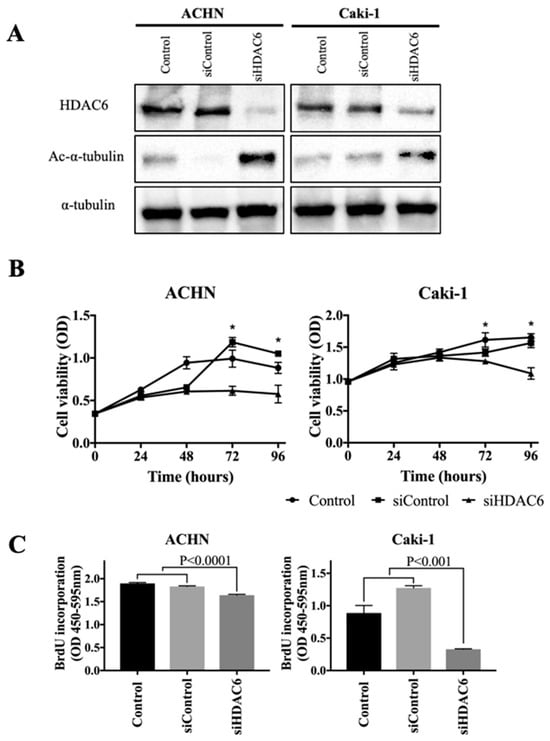 First, we performed knockdown of HDAC6 using siRNA to investigate the effect of HDAC6 inhibition on RCC cells. Knockdown of HDAC6 was confirmed by immunoblotting, as indicated by decreased expression of HDAC6 and increased expression of acetyl-α-tubulin (Figure 2A). As shown in Figure 2B,C, knockdown of HDAC6 decreased the viability and DNA replication of RCC cells.