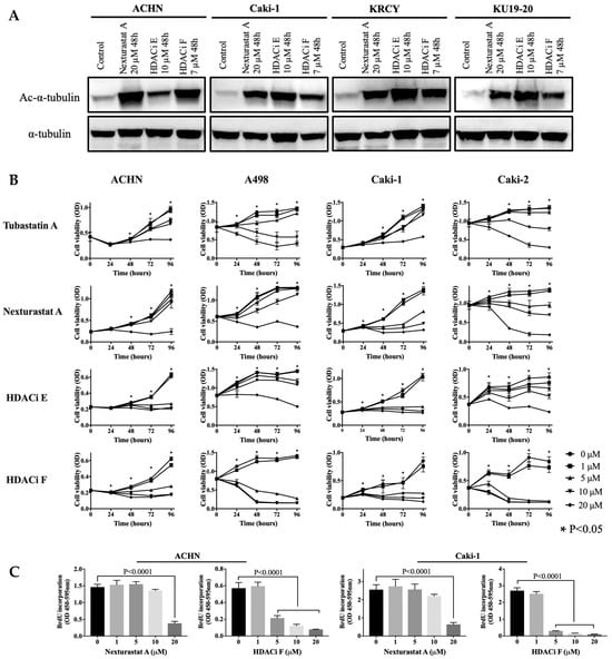 Next, we confirmed that three representative HDAC6 inhibitors with lower IC50s suppressed HDAC6 activity, as indicated by increased expression of acetyl-α-tubulin (Figure 3A). Using the MTS assay, we evaluated the ability of 12 selective HDAC6 inhibitors to suppress survival in RCC cells. As shown in Figure 3B and Figure S1 and Table 2 [19,20,21,22,23,24,25,26,27], treatment with these inhibitors decreased the viability of RCC cells in a concentration-dependent manner, with IC50 values in the low micromolar concentration range for most drugs. The results of the BrdU incorporation assay demonstrated that treatment with nexturastat A and HDACi F inhibited the DNA replication of RCC cells compared with the respective control groups (Figure 3C).