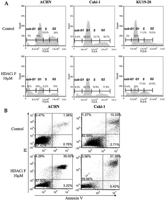 PI staining flow cytometry revealed that treatment with HDACi F for 48 h induced apoptosis, as indicated by the increased sub-G1 cell population in ACHN, Caki-1, and KU19-20 cells compared with the respective control groups (Figure 4A). Furthermore, treatment with HDACi F for 48 h increased the Annexin V/PI double-positive cell population, indicating late-stage apoptosis (Figure 4B).