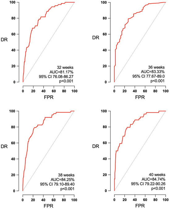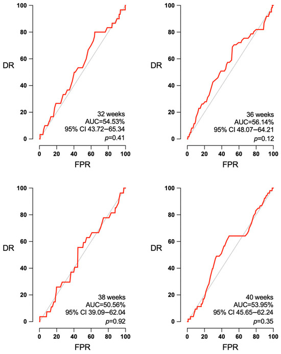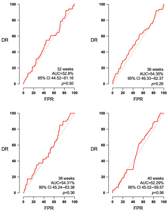Absence of predictive capacity of UA PI independently of the week of pregnancy. AUC: area under the curve, CI: confidence interval, DR: detection rate, FPR: false positive rate, p: p value.