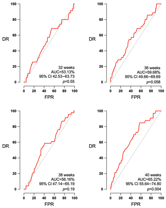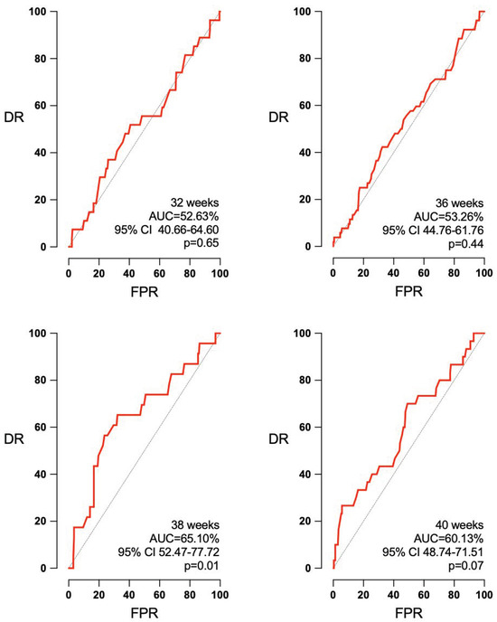 Concerning Doppler ultrasound, CPR and UA PI measurements were obtained in an important number of pregnancies: 256 and 302 at 32 weeks, 400 and 471 at 36 weeks, 222 and 273 at 38 weeks, and 256 and 454 at 40 weeks. Figure 3 shows the ability of CPR to predict APO at the four studied gestational ages. At 38 weeks, CPR was able to predict APO (AUC 65.10, 95% CI 52.47–77.72%, p = 0.01). However, no predictive ability was observed at 32 weeks (AUC 52.63, 95% CI 40.66–64.60%, p = 0.65), 36 weeks (AUC 53.26, 95% CI 44.76–61.76%, p = 0.44), or 40 weeks (AUC 60.13, 95% CI of 48.74–71.51%, p = 0.07). CPR was also predictive of SGA at 40 weeks, AUC 65.22 (95% CI 55.64–74.80%, p = 0.004), but not at 32 weeks, AUC 53.13 (95% CI 42.53–63.73%, p = 0.55); 36 weeks, AUC 59.58 (95% CI 49.66–69.69, p = 0.058); or 38 weeks, AUC 56.16 (95% CI 47.14–65.19%, p = 0.19) (Figure 4).