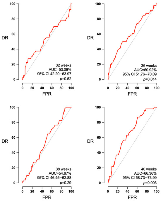 Concerning the UA PI, it was not predictive of APO at any of the studied intervals (32, 36, 38 and 40 weeks): AUC 54.53 (95% CI 43.72–65.34%, p = 0.41), 56.14 (95% CI 48.07–64.21%, p = 0.12), 50.56 (95% CI 39.09–62.04%, p = 0.92), and 53.95 (95% CI 45.65–62.24%, p = 0.35) (Figure 5). UA PI could predict SGA at 36 weeks (AUC 60.92, 95% CI 51.76–70.09%, p = 0.014) and at 40 weeks (AUC 66.36, 95% CI 58.73–73.99%, p < 0.003). But it had no predictive ability at 32 weeks (AUC 53.09, 95% CI 42.20–63.97% p = 0.52) or at 38 weeks (AUC 54.67, 95% CI 46.45–62.88%, p = 0.29) (Figure 6).