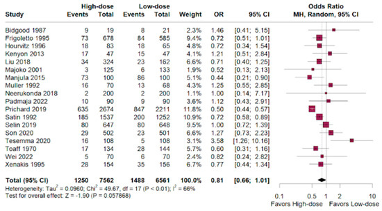 Cesarean section had a favorable outcome for the high-dosage group in patients randomized compared to the low-dose outcomes. (OR 0.81; 95% CI 0.66–1.01; p < 0.01; I2 = 66%; Figure 2).