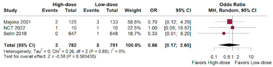 The odds ratio indicated prevalence for the high-dose group over the low-dose group in women receiving labor augmentation with oxytocin. (OR 0.66; 95% CI 0.17–2.65; p < 0.01; I2 = 0%; Figure 4).