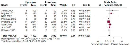 Among NICU admissions, there was a slight benefit for the high-dose group versus the low-dose group in women who underwent labor augmentation. (OR 0.84; 95% CI 0.68–1.02; p < 0.01; I2 = 0%; Figure 5).