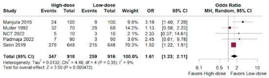 The hemorrhage odds ratio was nearly identical between both groups, with a slight lean towards the high-dose group versus low-dosage group. (OR 0.98; 95% CI 0.73–1.32; p < 0.01; I2 = 44%; Figure 3).