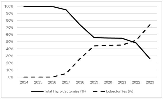- Conroy, P.C.; Wilhelm, A.; Calthorpe, L.; Ullmann, T.M.; Davis, S.; Huang, C.-Y.; Shen, W.T.; Gosnell, J.; Duh, Q.-Y.; Roman, S.; et al. Endocrine Surgeons Are Performing More Thyroid Lobectomies for Low-Risk Differentiated Thyroid Cancer since the 2015 ATA Guidelines. Surgery 2022, 172, 1392–1400. [Google Scholar] [CrossRef] [PubMed]