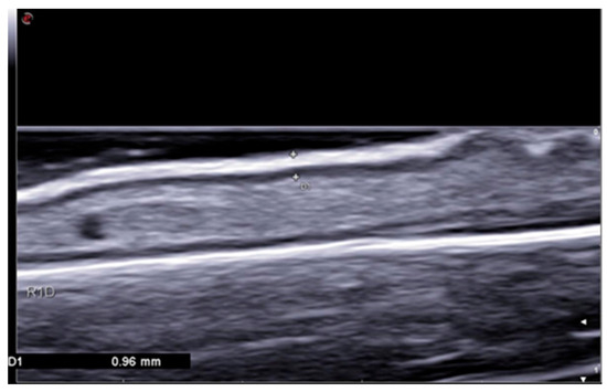 Skin ultrasonography was performed by two experienced ultrasonographers (S.C.D. and F.V.) blinded to the study group. Ultrasound evaluation and associated measurements were performed using an Esaote MylabX8 machine with a linear probe frequency of 10–18 MHz. Ultrasound images were obtained as longitudinal sections on the extension surface of the finger, hand, and distal forearm. A thick layer of gel was applied for each scan in order to limit any compression effects. Measurements were taken in three areas of interest in a symmetrical manner (left and right) as follows: Area 1—proximal phalanx of third finger; Area 2—second intermetacarpal space; and Area 3—distal forearm. The examination was performed bilaterally, and the mean value was recorded for each area of interest. The skin thickness was measured by including the epidermal and dermal layers (Figure 1). The values recorded for each region are expressed in millimeters.
