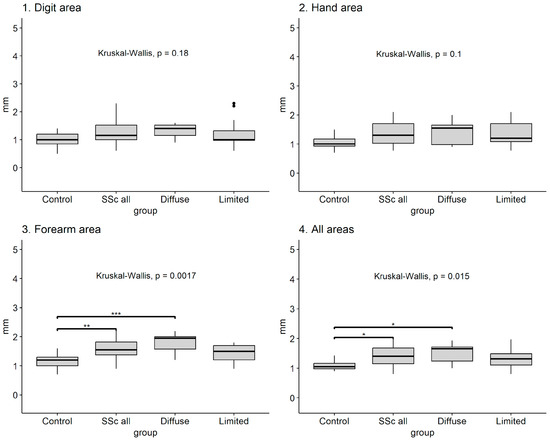 A comparison of mean skin thickness measurements was performed using a 2-sample t-test or Mann–Whitney U test, depending on the sample data distribution. The analysis included comparisons of skin thickness in the established areas of interest between the control group and SSc group, between the two subtypes of SSc, and with regard to the presence or absence of various disease features. The statistical analysis was performed in R Studio, version 2023.12.1.402.