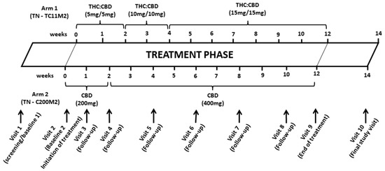 Following enrolment, participants were randomized 1:1 to receive THC:CBD combination oral capsules (2.5 mg/2.5 mg; TN-TC11M2), or CBD-only oral capsules (200 mg; TN-C200M2) [28,29]. Study capsules were manufactured and provided by Tilray Brands, Inc. (New York City, NY, USA). Participants were provided with a recommended titration schedule (Figure 1) and titrated up the number of capsules based on their tolerability, a method which has proven successful in other clinical trials [33]. We did not include a control group since the creation of a placebo arm would have added significant additional cost, required more time to manufacture the capsules and may have contributed to additional regulatory delays for this initial pilot study. The trial was open. We had considered blinding participants, but blinding in cannabinoid studies is often difficult since participants will often recognize the effects, such as psychoactive or vasoactive effects, which cannabinoids can induce [3].