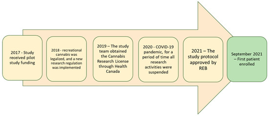 A study timeline is depicted in Figure 2. The first form of financial support was obtained in 2017. In 2018, Canada implemented the Cannabis Act, legalizing the use of cannabis for recreational purposes and enabling individuals to purchase and possess cannabis without a medical prescription. Along with this change in legislation came the need for researchers to possess a Cannabis Research License through Health Canada, which required 11 months to obtain. In 2019, the Cannabis Research License was obtained.