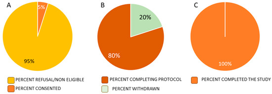 Consent rate. Recruitment (A). We approached 205 potential participants, but only ten individuals were eligible for study enrolment and randomization, for a consent rate of <5% (10/205); Retention (B)—withdrawn for safety reasons (transaminitis and aggravation of pre-existing anemia due to frequent blood draw); and Percent that completed the study (C).