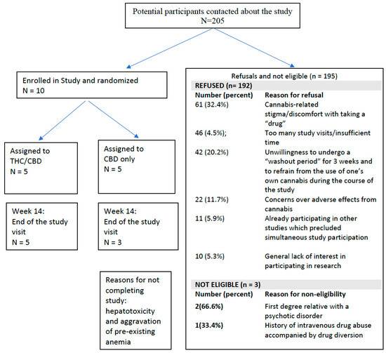 We approached 205 potential participants. Ten were consented and randomized for a consent rate of 5%. There were 195 individuals that refused or were not eligible. In four cases out of seven, individuals did not agree to undergo a washout period of their current cannabis product and did not believe they could undergo a washout due to favorable effects of cannabis on their chronic pain or mood, presenting a barrier to recruitment. One of these individuals indicated that a barrier to study participation was that it can take nearly a year for approval for reimbursement from a government reimbursement program to access CBD for free and participation in this study would halt access to CBD through this reimbursement program. In three cases out of seven, individuals had contra-indications to study enrolment which were not detected via chart review screening. Therefore, only three individuals were eligible for study enrolment and seven were enrolled with minor protocol deviations as shown in Figure 3. Reasons for low recruitment numbers are presented in Figure 4.