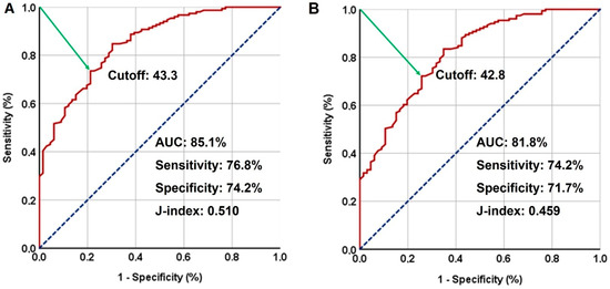 | 90–100 | 70–80 | p-Value | 0–1 | 2 | p-Value | <90 U/m/L | ≥90 U/m/L | p-Value | <42.8 | ≥42.8 | p-Value | Absent | Present | p-Value | ||