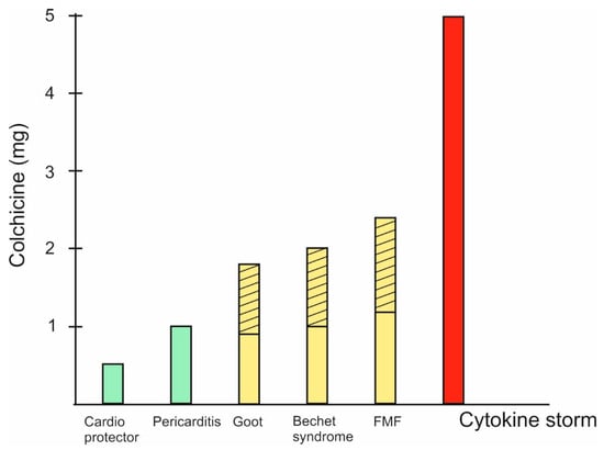 - Karatza, E.; Ismailos, G.; Karalis, V. Colchicine for the treatment of COVID-19 patients: Efficacy, safety, and model informed dosage regimens. Xenobiotica 2021, 51, 643–656. [Google Scholar] [CrossRef]