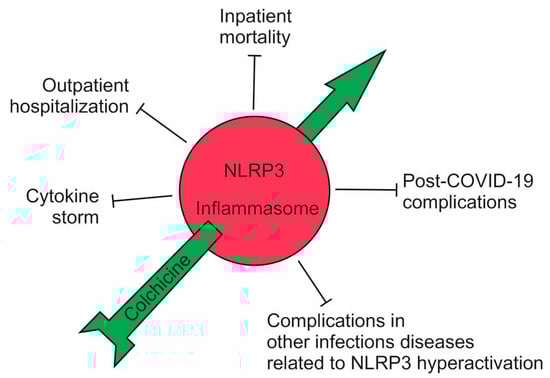 - Cheema, H.A.; Jafar, U.; Shahid, A.; Masood, W.; Usman, M.; Hermis, A.H.; Naseem, M.A.; Sahra, S.; Sah, R.; Lee, K.Y. Colchicine for the treatment of patients with COVID-19: An updated systematic review and meta-analysis of randomised controlled trials. BMJ Open 2024, 14, e074373. [Google Scholar] [CrossRef] [PubMed]