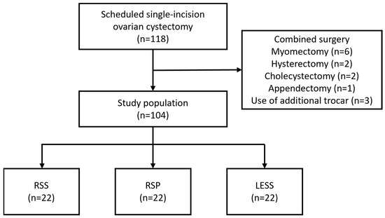 This retrospective study reviewed 118 patients with ovarian tumors who underwent ovarian cystectomy using either LESS, RSS, or RSP at our institution (Figure 1). Fourteen patients were excluded due to the use of an additional port or combined surgery. Ultimately, from January 2021 to December 2023, 22 patients underwent RSP, 52 underwent RSS, and 30 underwent LESS, all performed by a single surgeon. The characteristics and performance metrics evaluated include age, BMI, tumor size, hemoglobin drop, operative time, docking time, console time, and the side of the tumor.