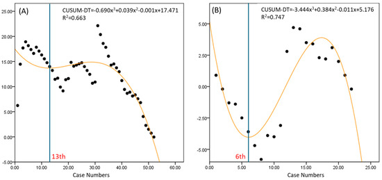 Learning curves for docking time in robotic surgery. (A) Robotic Single-Site platform, (B) Robotic Single-Port system. CUSUM-DT; cumulative sum of docking time.