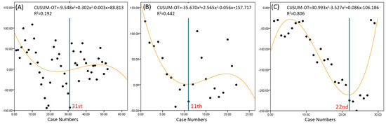 Learning curves for operation time in robotic surgery. (A) Robotic Single-Site platform, (B) Robotic Single-Port system, (C) laparo-endoscopic single-site surgery. CUSUM-OT; cumulative sum of operation time.