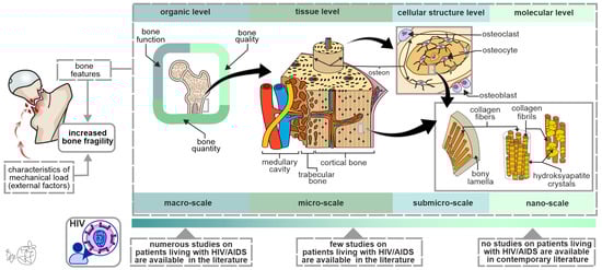 Given that the occurrence of bone fractures and their complications are preventable [10,11], it is important to understand all factors that contribute to increased bone fragility in PLWHIV. Addressing the issue of an increased fracture risk will improve quality of life, promote healthy aging, and reduce healthcare costs for these individuals. Considering the clinical relevance of bone fragility, this article aimed to provide a comprehensive narrative overview of the contemporary literature related to skeletal alterations in PLWHIV, with a particular focus on the importance of a multi-scale approach in assessing the bone hierarchical organization.