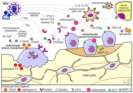 Schematic representation of molecular mechanisms contributing to bone alterations in patients living with HIV/AIDS. The figure contains multiple factors leading to bone changes in PLWHIV, with an emphasis on the factors that cause reduced bone formation and factors that stimulate bone resorption (the activating effect is marked with a green sign, while the deactivating effect is marked with a red sign; upward arrow symbol indicate higher concentrations, while downward arrow symbol indicate lower concentration of the molecule). Abbreviations: PTH—parathyroid hormone; IL—interleukin; TNF-α—tumor necrosis factor-α; ALP—alkaline phosphatase; OC—osteocalcin; OPG—osteoprotegerin; Vpr—viral protein R; M-CSF—macrophage colony-stimulating factor; Tat—trans-activator of transcription; RANK—receptor activator for nuclear factor-kappa B; RANKL—receptor activator for nuclear factor kappa B ligand; BMP-2—bone morphogenic factor-2.