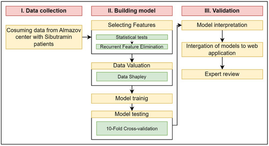 Having collected the dataset, we continue research by pre-processing this data. As it was mentioned, the main goal of our decision system is to predict the most possible outcome of obesity treatment. So, we set binary labels as targets for the model corresponding to the treatment success thresholds at 5% for the 3-month period and 7% for the 6-month period. Additionally, we appended the result of 3 months of treatment in the model for the second visit after completing the first part of therapy. One of the key features of the system, as stated before, is the utilization of the most available and low-cost parameters in the clinical practice set. So, the model building process is divided into two stages: the described parameters are applied to the models, and then, to make the decision more stable, the expert appends scientific parameters (hormones, mRNA, and other tests).