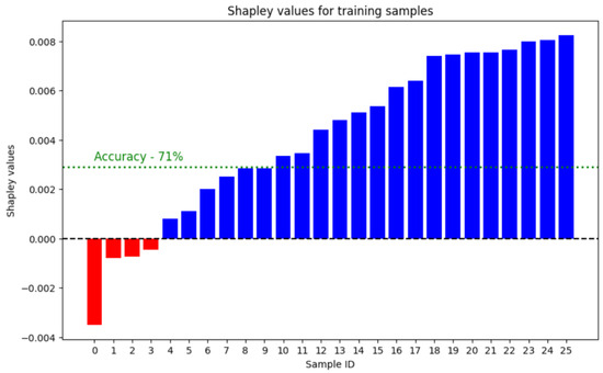 Sample filtering was performed only for the model with a 3-month forecast using a truncated set of parameters, as this configuration leads to the worst quality and requires advanced tuning. We evaluated the training samples using Data Shapley methods to identify noisy and unhelpful training data. Data valuation was made using the TMC–Shapley method [23] with Random Forest as a classification model in 4500 iterations, and the accuracy metric was used for validation on test split. The result is shown in Figure 2, where samples with the least Shapley values are presented. Accordingly, four samples from the training set have negative Shapley values and have a negative impact on model accuracy.