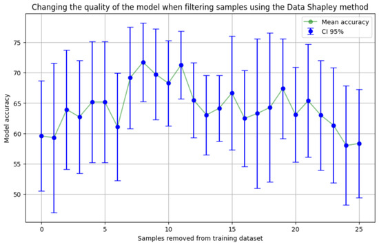 For a clear decision on the number of samples to remove, we iteratively removed samples in ascending order of Shapley values and evaluated the accuracy of the model trained with a new set of training examples. As shown in Figure 3, after removing eight samples, we were able to achieve improved accuracy up to 71.75% (±6.48%), and subsequent removal of samples did not further improve the quality.