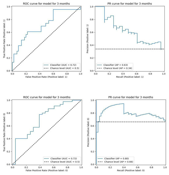 ROC curve and PR curve of model for 3 months without scientific parameters for labels 0 and 1.