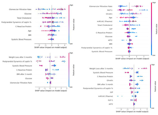 The addition of GLP-1, GIP, ghrelin, miR142, and sST2 parameters improved the quality of the classifiers, achieving 75% for 3 months and 84% for 6 months. Such models will be more useful for the work of a research scientist who seeks to understand the mechanisms of action of a particular drug at the hormonal and molecular genetic level.