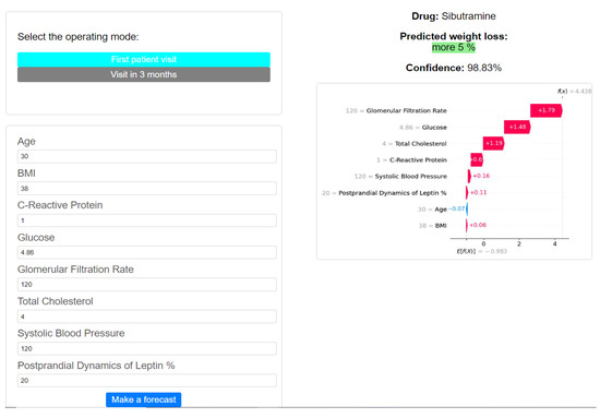 To utilize the trained ML models and interpretation algorithms, we developed a web application using Flask. This application loads pre-trained XGBoostClassifier models and, based on user input values, predicts treatment outcomes. Users can select between two modes: the first visit or the visit after 3 months, and they can specify whether parameters from the third group (GLP-1, ghrelin, etc.) are utilized or not. The application source code can be found on GitHub: https://github.com/geniusserg/Endocrinology (accessed on 1 July 2024). An example of using the developed application for one of the real patients is shown in Figure 6