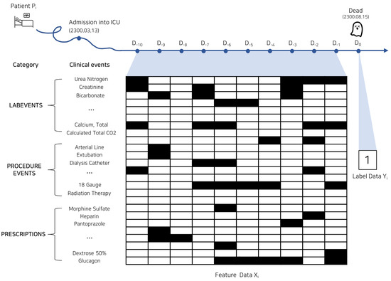 - We investigate the death or discharge date of the ith patient from the ADMISSIONS file and set that date as the reference date (D0) for that patient. We then extract medical event data for 10 days before the reference date (i.e., ( where, T = 10) from the LABEVENTS, PROCEDURE EVENTS, and PRESCRIPTIONS files. LABEVENTS refers to results of experimental test such as blood tests, PROCEDURE EVENTS denotes data related to the patient’s procedures, and PRESCRIPTIONS represents the patient’s prescribed medications.