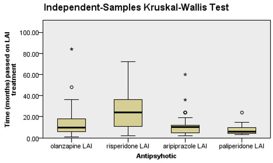 There were significant differences between the groups regarding the LAI antipsychotic treatment duration (p < 0.0001), as follows: patients on risperidone had a significantly longer LAI antipsychotic treatment duration than patients on olanzapine (p = 0.04), aripiprazole (p = 0.03), or paliperidone (p < 0.0001), since it was the first LAI second-generation antipsychotic introduced in clinical practice (Figure 1).
