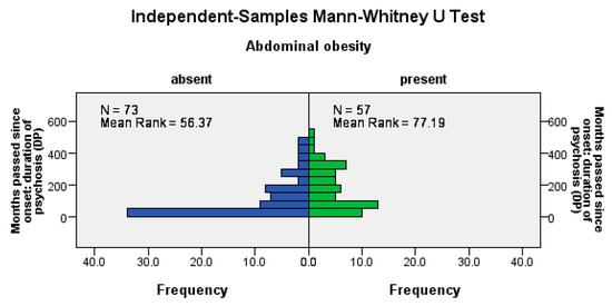 Abdominal obesity was significantly more frequent among patients with a longer psychosis duration (U = 1414, Z = −3.13, p = 0.002), among patients with a longer LAI antipsychotic duration (U = 1515, Z = −2.66, p= 0.008), and among those with a longer pre-LAI antipsychotic duration (U = 1474, Z = −2.85, p = 0.004); see Figure 2.