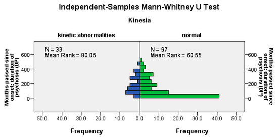 Hypokinesia disorders were significantly more frequent among patients with a longer DP (U = 1120.5, Z = −2.57, p = 0.01), among patients with a longer LAI antipsychotic duration (U = 1162.5, Z = −2.66, p= 0.02), and among those with a longer pre-LAI antipsychotic duration (U = 1178, Z = −2.26, p = 0.02); see Figure 3.